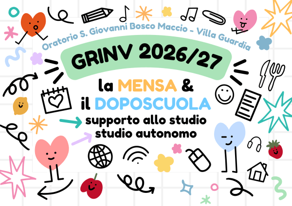 IL PROGETTO GRINV è il servizio di mensa e doposcuola per i ragazzi delle scuole medie. Grinv sarà attivo dal 15 settembre 2026 all’ 8 giugno 2027, le attività seguiranno i giorni di frequenza stabiliti dal calendario scolastico 2026-27 dell’IC Villa Guardia. Grinv si svolge dal lunedì al venerdì negli spazi dell’oratorio S. Giovanni Bosco... Continua a leggere →